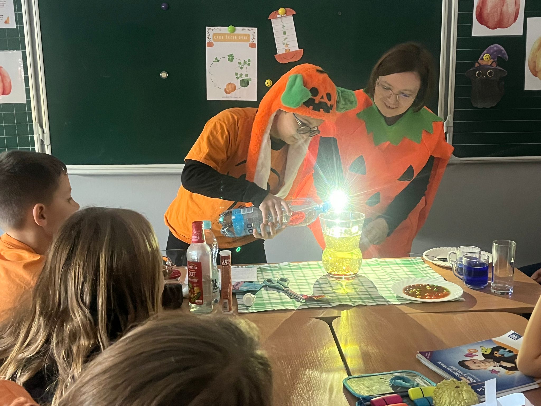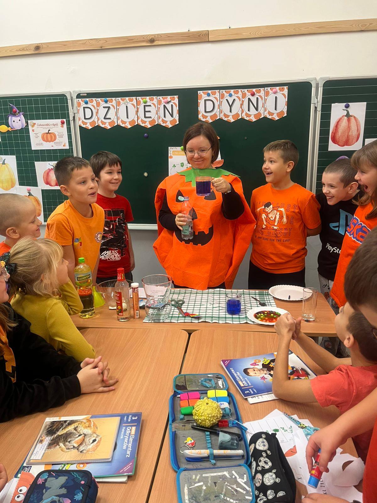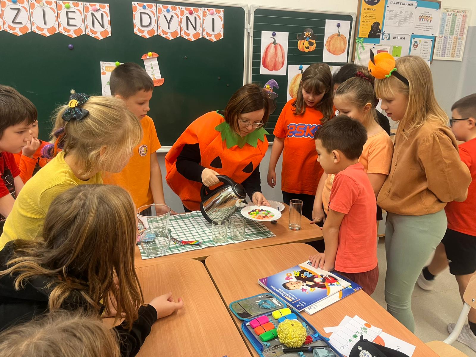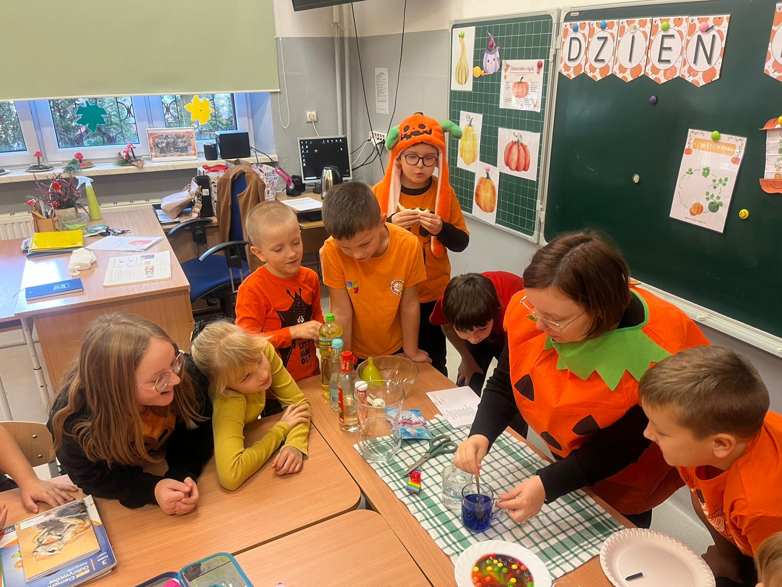 W trakcie obchodów Dnia Dyni uczniowie klasy 3b poznali sposoby na wykorzystanie produktów spożywczych i higienicznych po poznania podstaw chemii. Dzieci wraz z wychowawcą wykonały eksperyment "Lampa lava", "Jesienny podmuch wiatru czyli jak oryginalnie napompować balon". Mogły także zaobserwować jak barwniki spożywcze wpływają na wygląd popularnych cukierków. W trakcie eksperymentu "Gdzie jest atrament?" poznały właściwości octu, który sprawił, że woda w szklance znów stała się granatowa. Najwięcej emocji wzbudziło doświadczenie "Wulkan"(otrzymywanie soli w wyniku reakcji chemicznej sody oczyszczonej i octu). Bo zabawa i nauka idą ze sobą w parze.