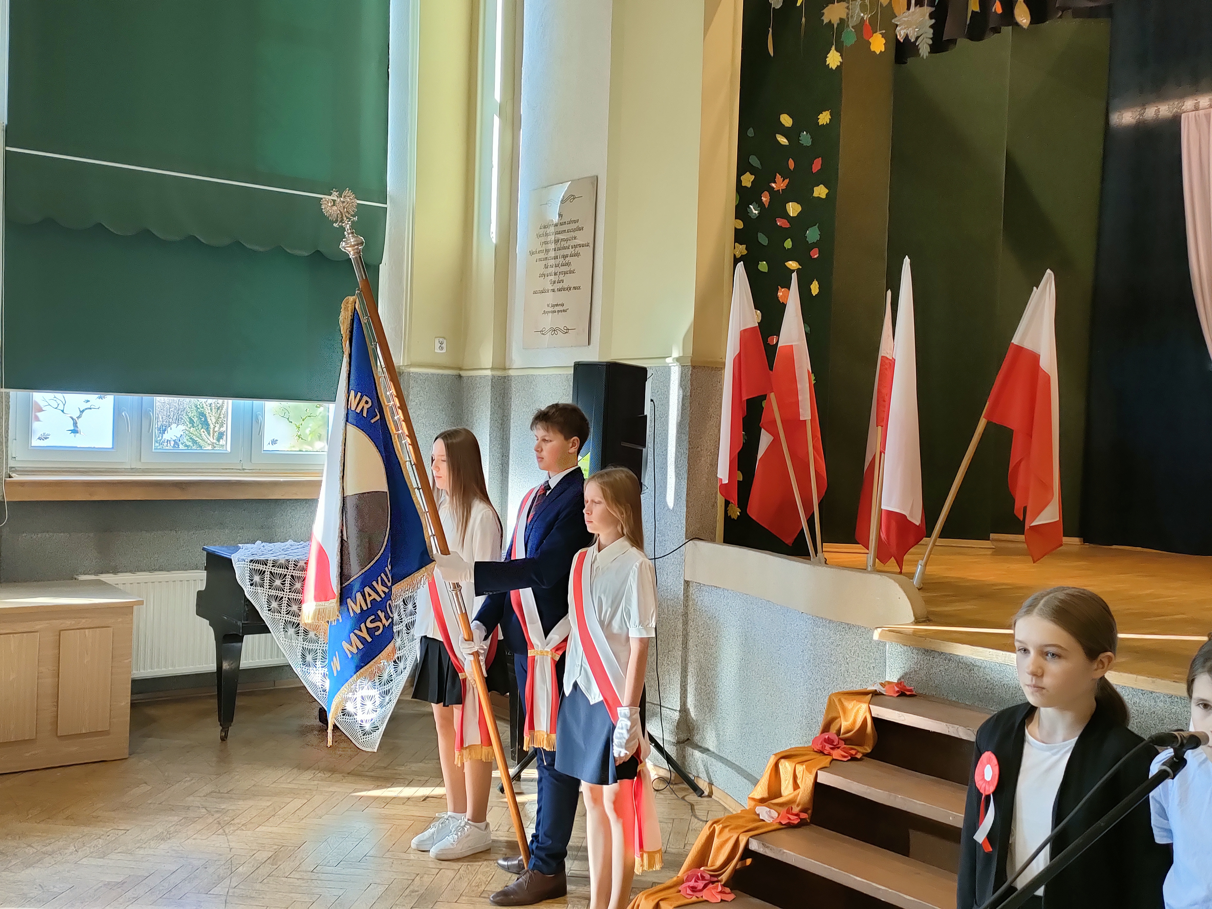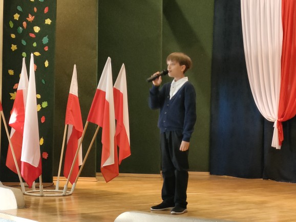 W szkolne obchody Święta Niepodległości angażujemy się zawsze bardzo chętnie. W tym roku stanęliśmy na scenie, aby recytować i śpiewać. Mamy w swoich szeregach zarówno chórzystów, jak i solistów. Pięknie wystąpili: Maj Sławińska, Karolina Kędra, Alicja Matwijczyk, Zuzanna Brygoła. Na scenie wystąpili: Dawid Czaja-Miller, Mateusz Olczyk, Karol Ruda, Jakub Adamski. Zuzanna Brygoła wykonała piękny utwór "Elegia o chłopcu". Było czego posłuchać. Całość Apelu z okazji Święta Niepodległości dopilnowali pan Jarosław Sitko oraz pan Grzegorz Wojtek.